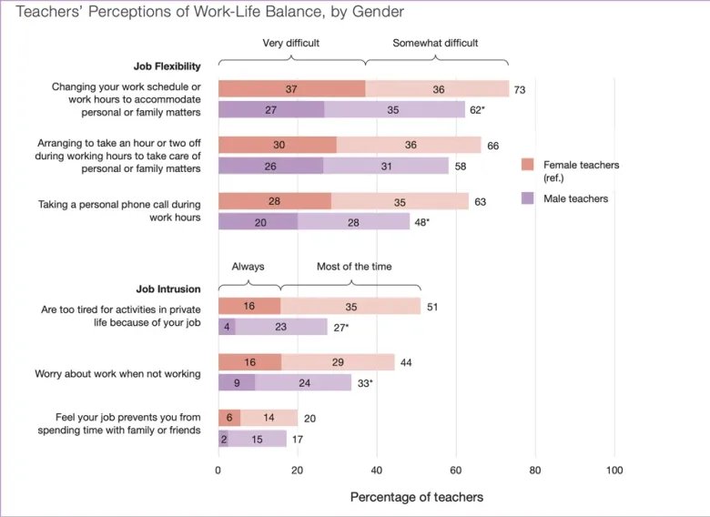 than half of female teachers said they were frequently or always too tired for activities in their private life because of their job. Only 27% of male teachers reported the same. About 44% of women said they worry about work when they aren’t at school, versus 33% of men.